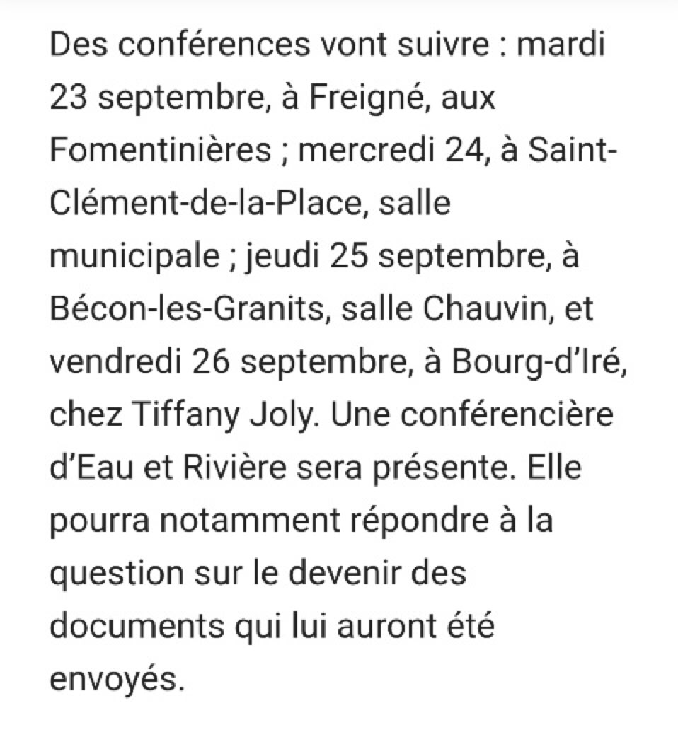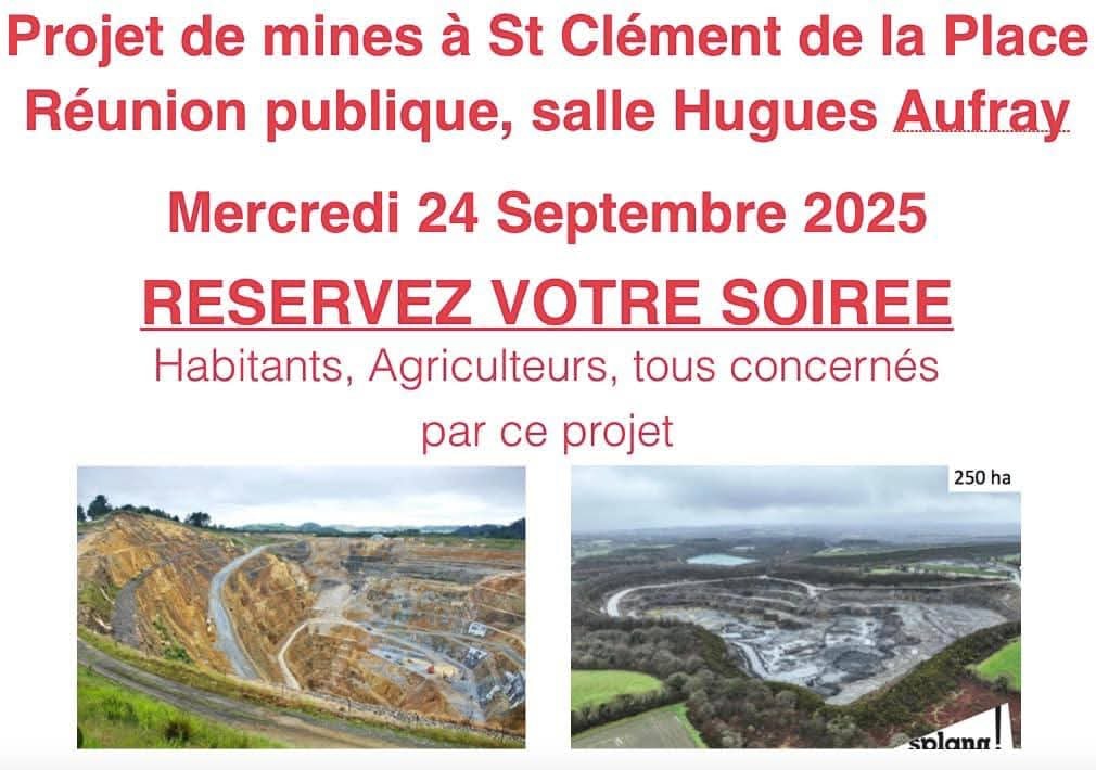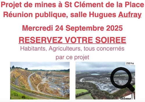 Grande réunion publique de Saint Clément de la Place qui aura lieu à 20 heures . Devrait être présente Dominique Williams d' Eaux et Rivières de Bretagne.