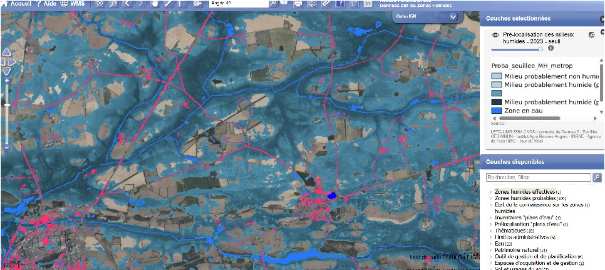 Carte de Pré localisation des milieux humides secteur Angrie (Réseau Partenarial des Données sur les Zones Humides) 2023. On voit que cela n’a rien à voir avec la carte présentée par Breiz Ressources, les zones humides prélocalisées sont importantes. Trop importantes sûrement pour Breiz Ressources.